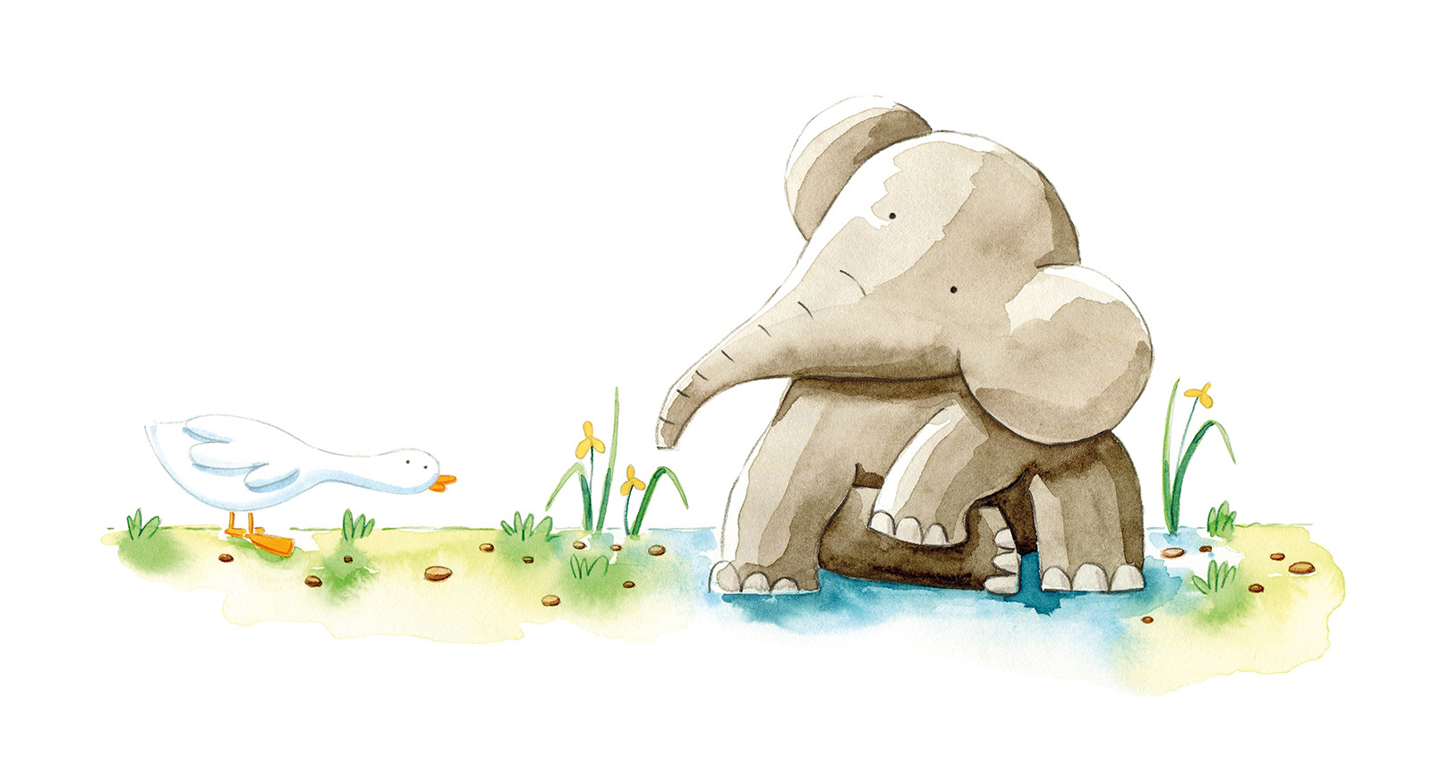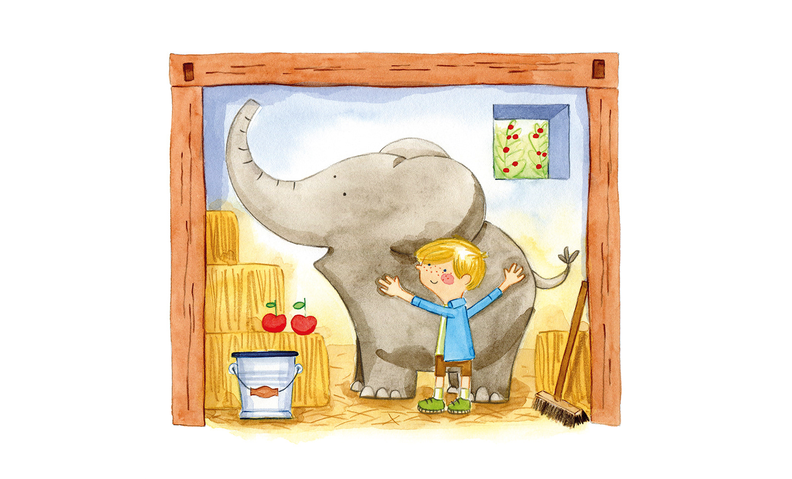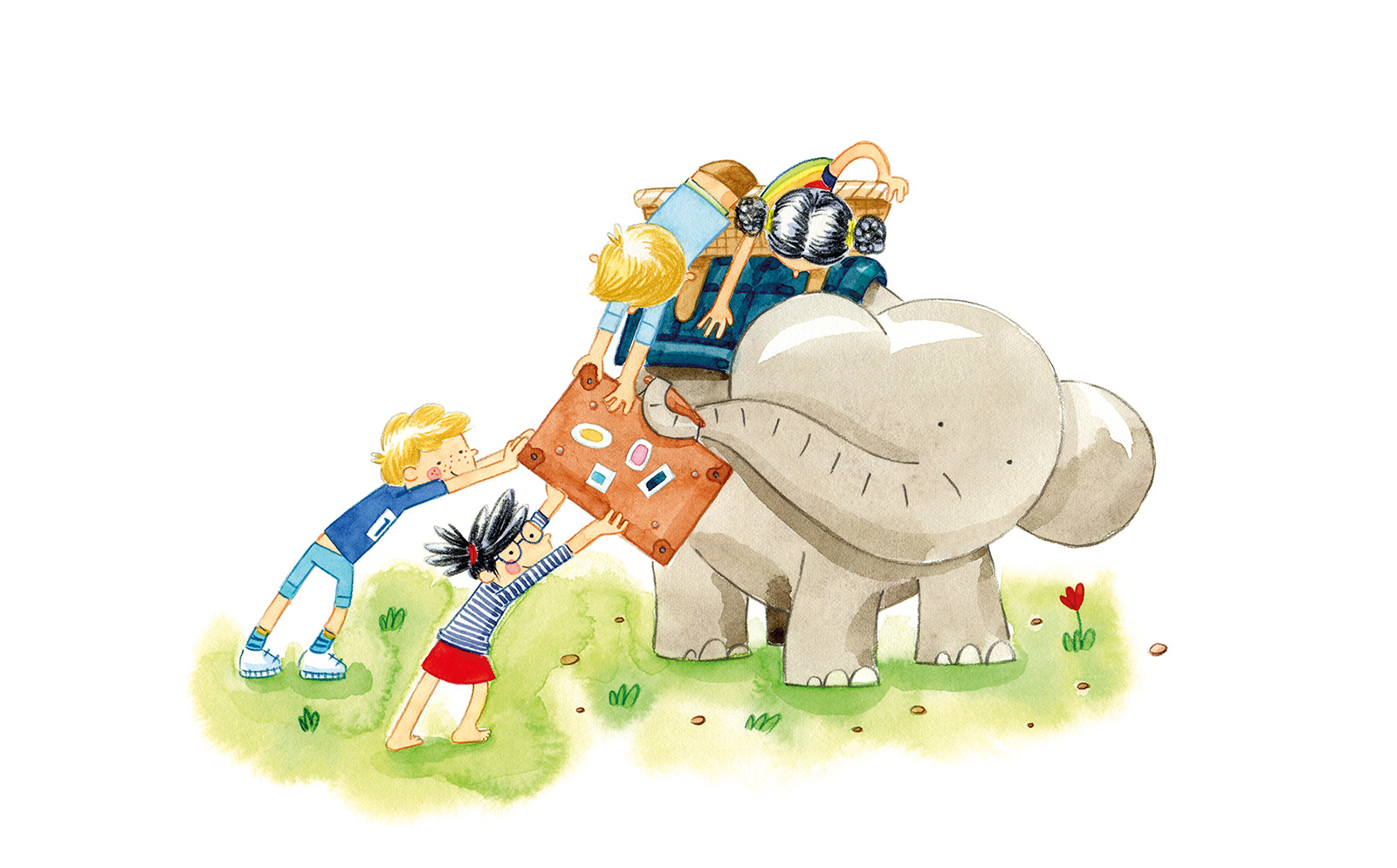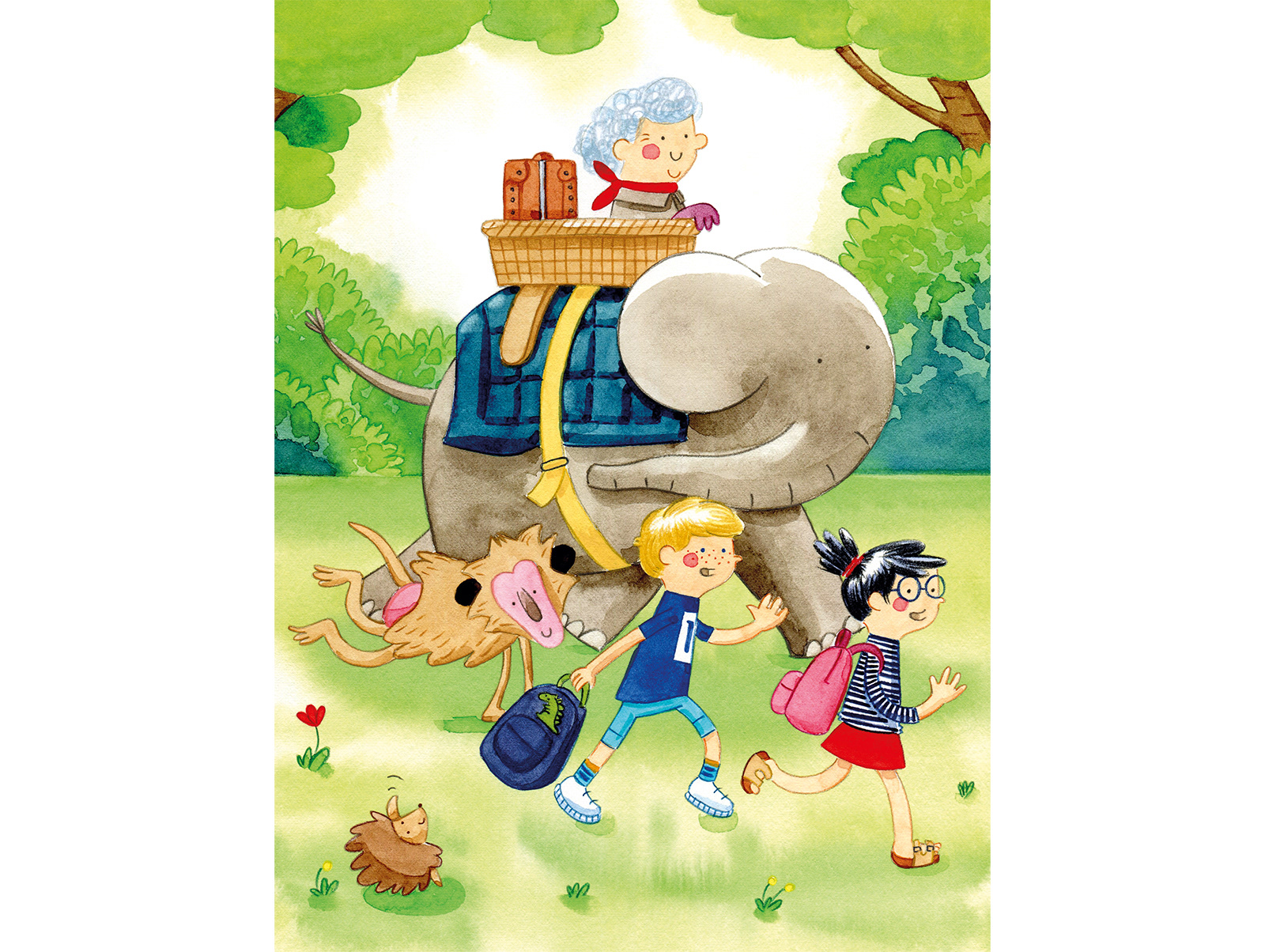 Illusztrációk Komjáthy Nessie, Elefánt a Bakonyban című mesekönyveihez. Szeretek olvasni! sorozat, Babilon Kiadó, 2023.